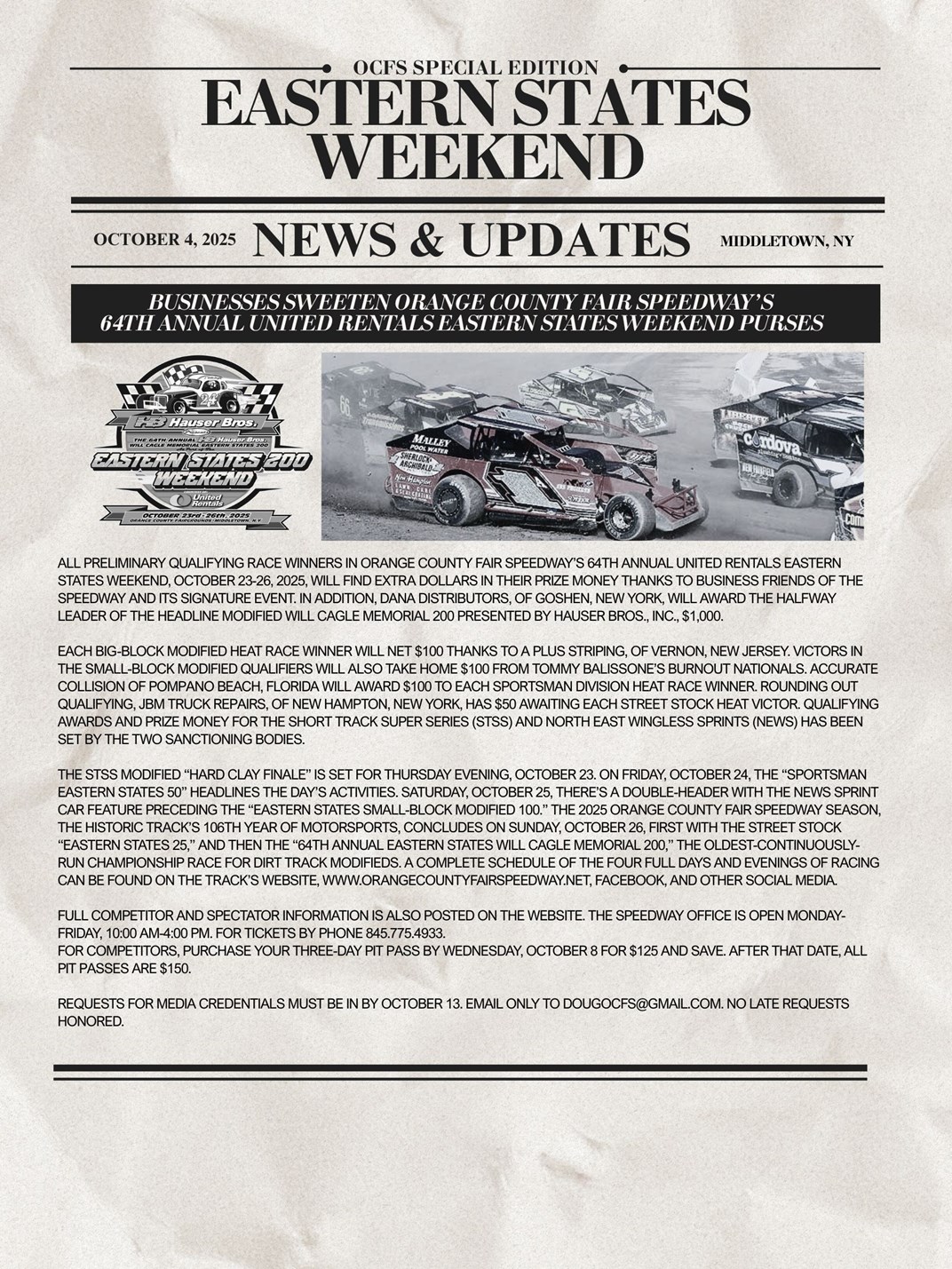 BUSINESSES SWEETEN ORANGE COUNTY FAIR SPEEDWAY’S 64TH ANNUAL UNITED RENTALS EASTERN STATES WEEKEND PURSES